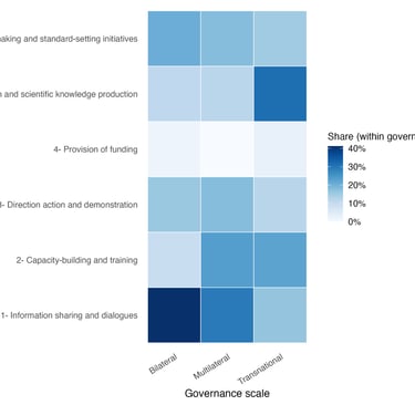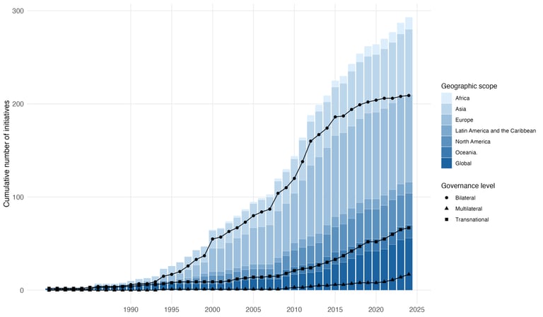 Until the mid-2000s, Chinese-led environmental initiatives were highly concentrated in Asia and Europe. Since the late 2000s, their reach has expanded to other regions and increasingly adopted a global scope. Notably, around 40% of the initiatives established since the mid-2010s operate at the worldwide level, reflecting China’s growing ambition to engage in global environmental governance.