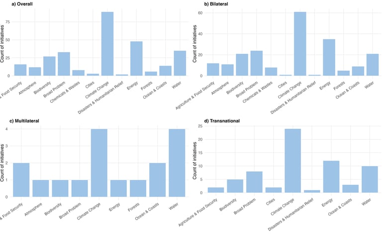 China’s efforts to lead global environmental governance primarily focus on climate change (30%), followed respectively by energy (16%), water (12%). Meanwhile, around 11% of the initiatives in our database address broad environmental issues without having a specific focus.