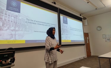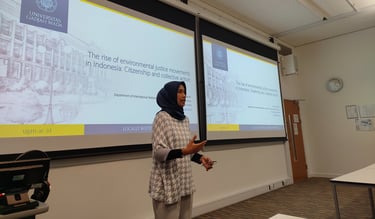 This week, Assistant Professor at the Department of International Relations at Universitas Gadjah Mada, Dr Maharani Hapsari, visited the University of Bath. Dr Hapsari joined them for their fortnightly meeting for project updates, then gave a talk as part of the ESG Seminar series on the rise of environmental justice movements in Indonesia. This talk covered how the case of palm oil justice movements in Indonesia reveals that struggle is not neutral from contestation, arising within the collective political groups seeking to transform the existing power structure towards a more desirable and just alternative order. Instead, such contestation is a product of contending discourse articulated by activities within the movement, which shapes their identity, approach and strategy in promoting justice as part of the collective action.